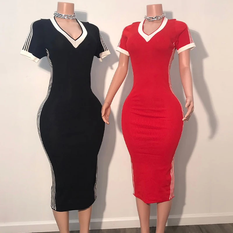Huili Manufacturer Custom logo 100% Cotton Black Knitted Modest Summer V Neck Solid Color Short Sleeve Maxi Red Dress for Women